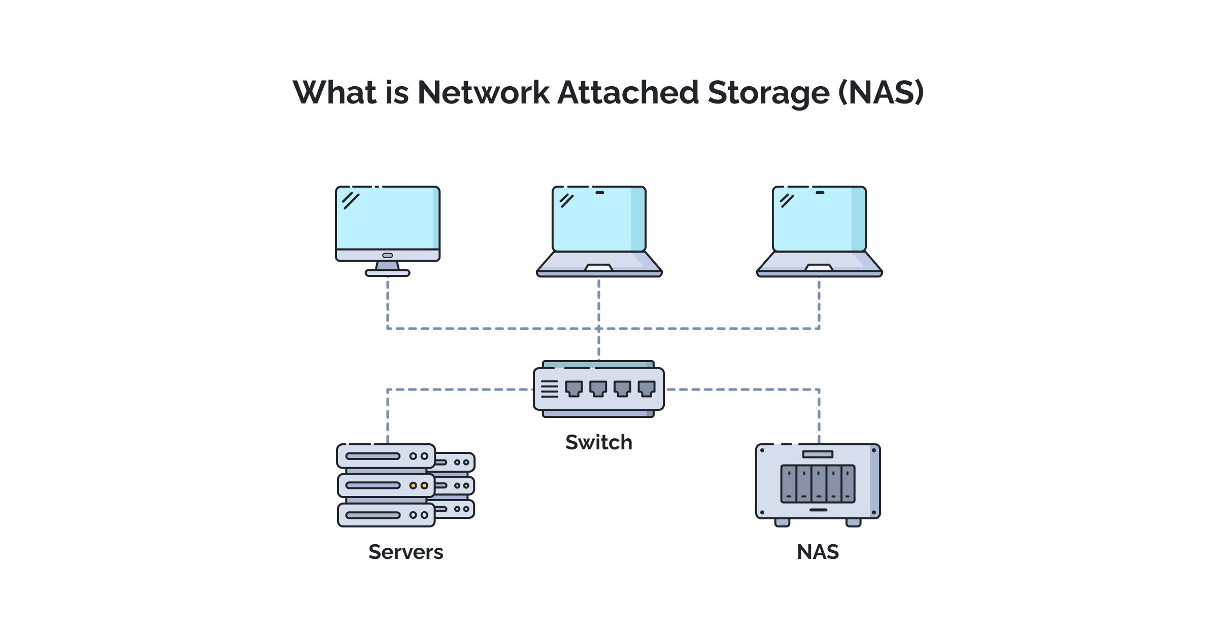 Network-attached storage (NAS): It provides a file storage system over a network. It is mostly used in servers where a company's LAN is used to store files in a central server and any system which has access and is connected to the local network can access those files. While there might be performance issues accessing a file over a network we get various benefits like huge storage capacity, reduced file redundancy when used across multiple people, and sharing large files across multiple machines.